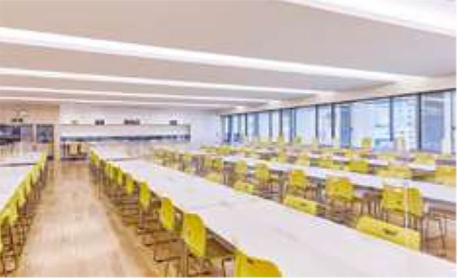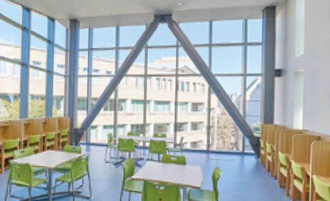 情報教室や柔剣道場、食堂、委員会室等があります。大きい吹き抜けの窓に面したテラスは、生徒たちの憩いの場です。