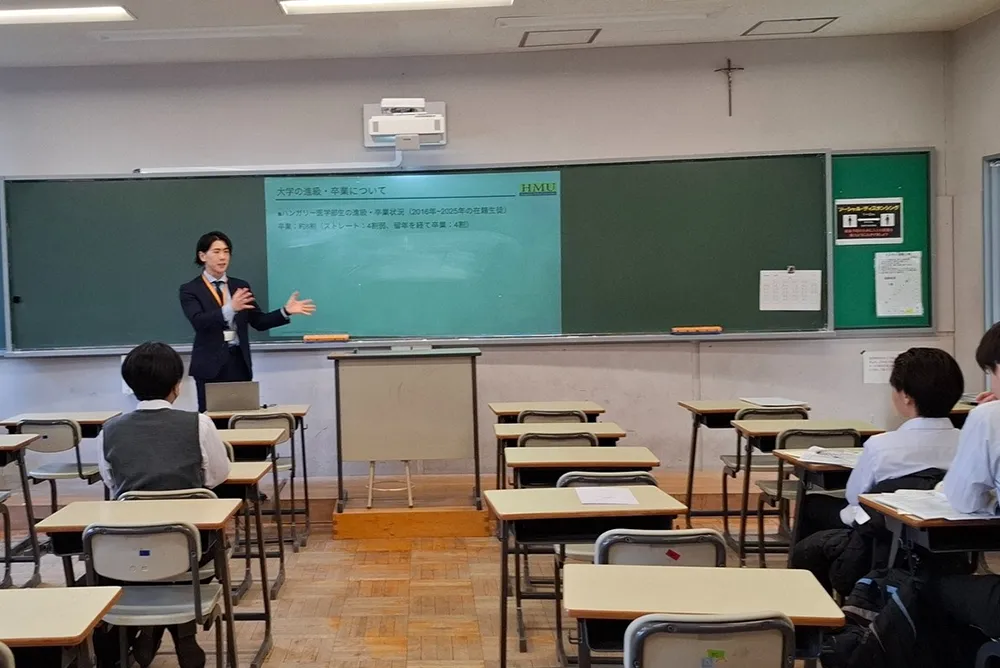 担当者からは、海外大学における進級の仕組みやカリキュラムの特徴、在学している日本人学生の人数やサポート体制などについて、具体的で分かりやすい説明がありました。特に、海外の大学で医師を目指す際に必要となる学習計画や心構え、実際の学生生活に関する話は、参加者にとって理解を深める大きな助けとなりました。