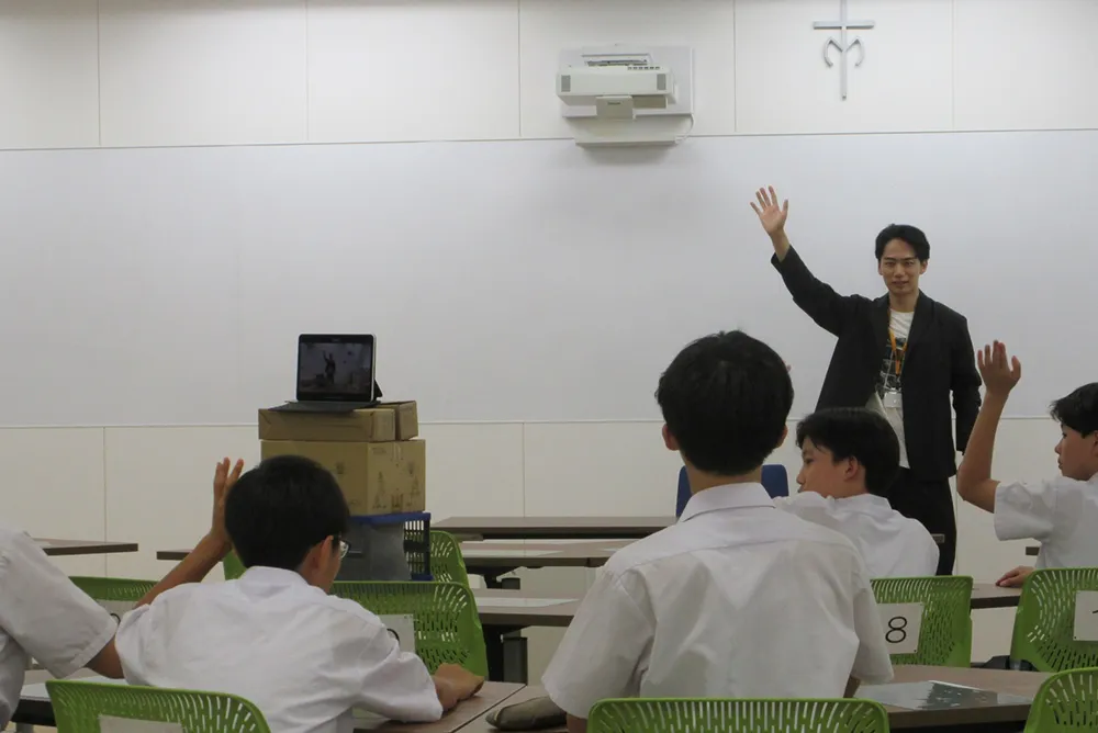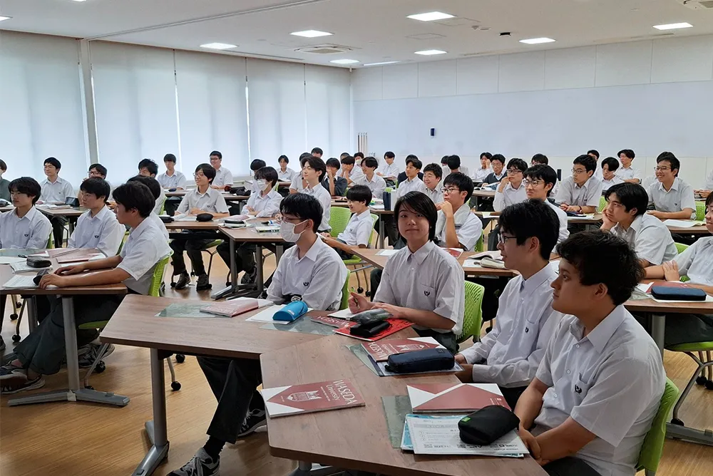 本校では海外大学への進学を志望する生徒を対象に、OBによる海外大学進学懇談会を希望者向けに実施しています。実際に海外大学で学んだOBが、進学を決意した理由や準備や流れ、現地での学生生活、どのような学習を進めてきたかなどを自身の経験をもとに具体的に語ります。生徒は進路選択に関する疑問や不安を直接質問でき、海外進学をより現実的に考える貴重な機会となっています。