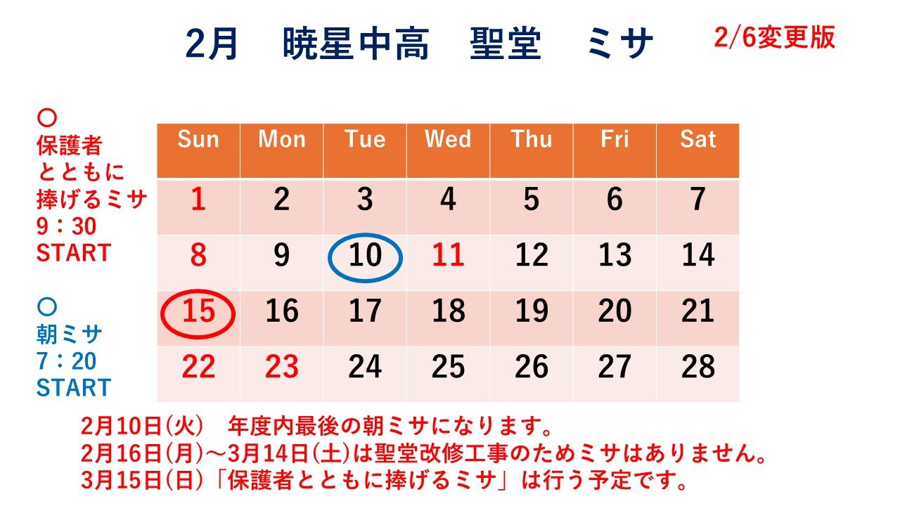 暁星中高・聖堂の2月のミサの予定です。2月6日変更版です。