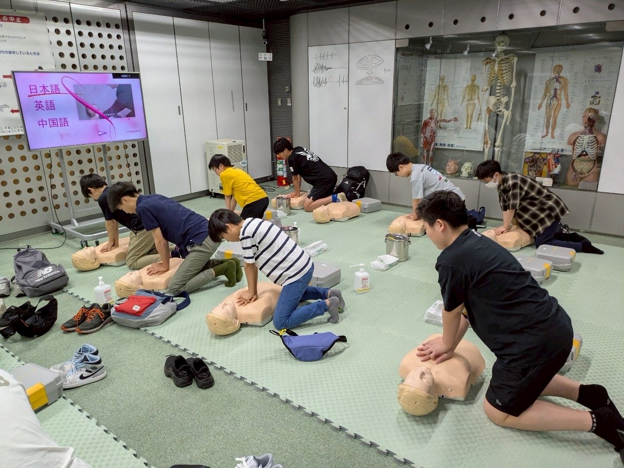 最後に応急救護、いわゆる心肺蘇生法を体験しました。人形を傷病者として胸骨圧迫やAEDの使い方を学びました。
