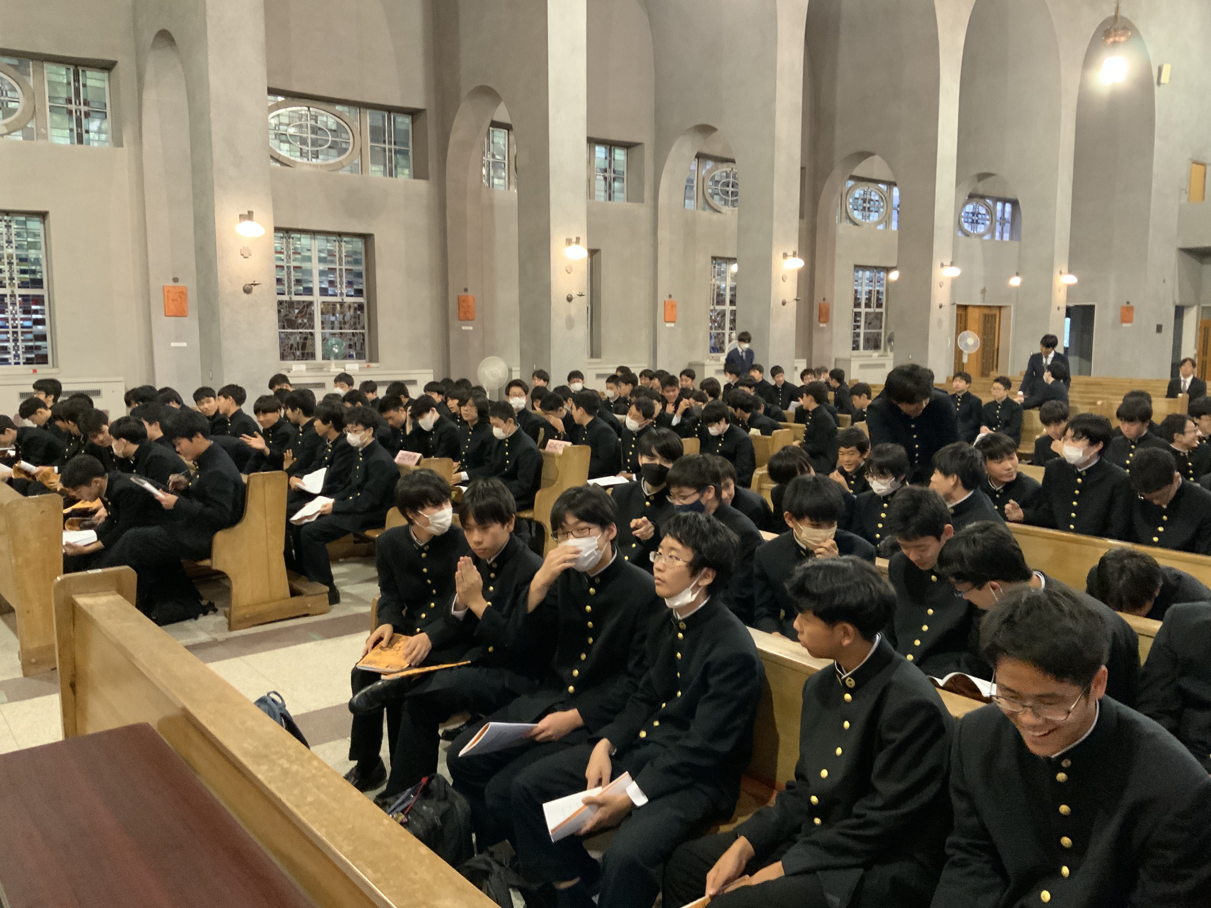 その後、カトリック幟町教会へ。平和祈願のミサを捧げました。一般的に世界平和記念聖堂の名で知られるこの幟町教会は、身をもって戦争が罪悪であることを体感したフーゴー・ラッサール神父が建造を呼びかけ、当時の教皇ビオ12世の祝福のもと、多くの人々の協力によって1954 年に献堂されました。まさに、人類が民族や宗教などの壁を越え、平和を願う気持ちによって建てられた教会です。(中3 H・T)