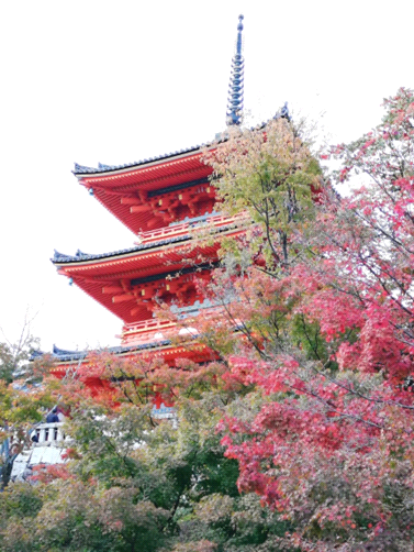 1か所目は清水寺です。778年に創建された由緒正しいお寺。やはり三重塔は有名です。そして清水寺といえば、「清水の舞台」も見なければ。左奥にうっすらと京都タワーが見えます。京都は景観保護のため建物の高さが制限されているので、高さがわずか131mの京都タワーも目立って見えます。さて、清水寺を一通り見たところで、次の場所に行きます。清水寺に行こうと思っている方は、朝早い時間帯がおすすめです。午後はもちろん、午前中も10時を過ぎるとたくさんの観光バスがやってきます(だからこそ今回はあえて清水寺にしました)。朝早い時間帯でも修学旅行生がたくさんいて身動きが取れなかったので、午後どうなるかは想像がつきます。