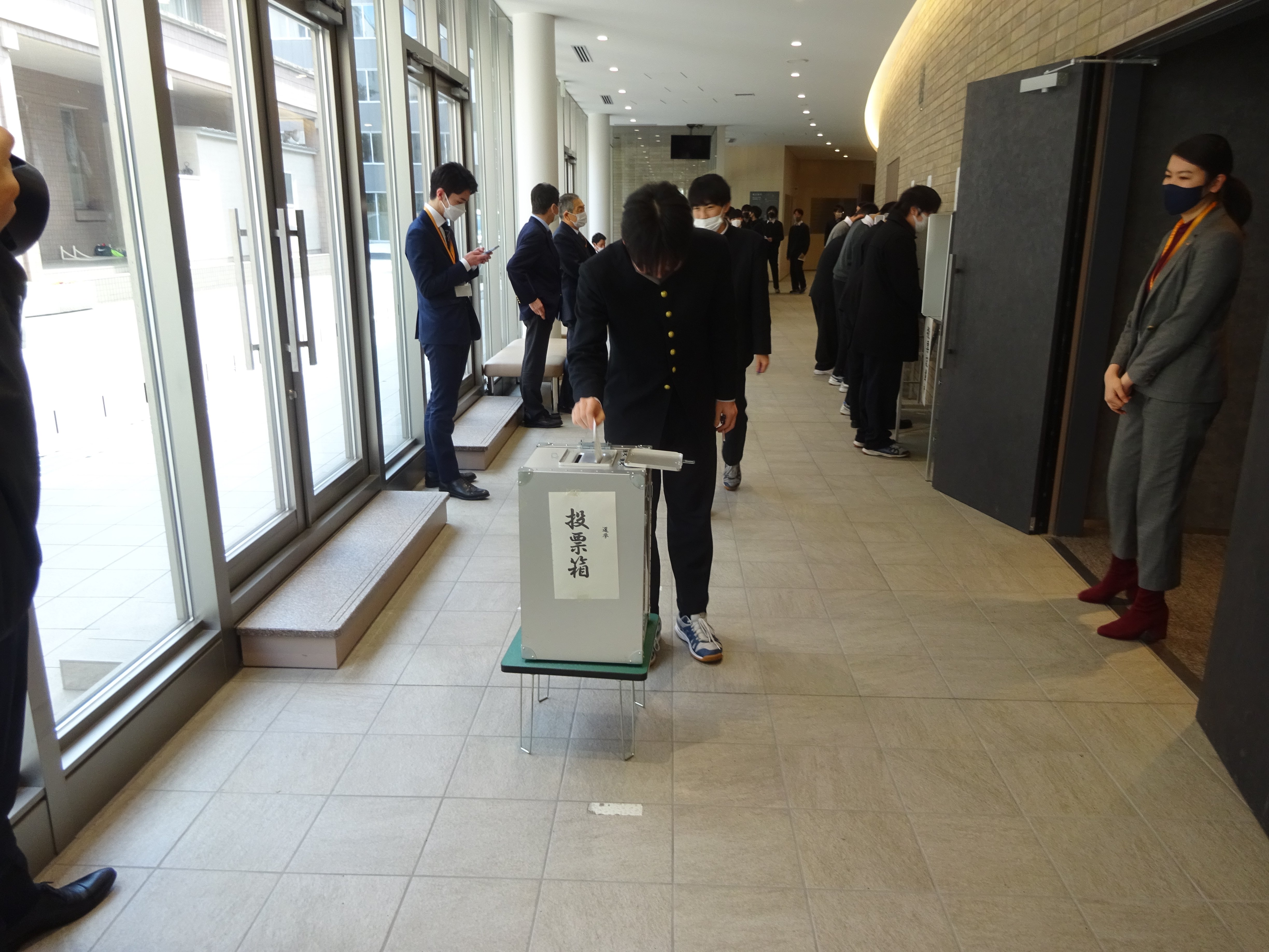 2月14日(火)に学校で模擬選挙を行いました。東京青年会議所の方々が来てくださり、財政困難な「未来区」という設定で、区長を決めます。立候補者は3名。それぞれが公約を掲げており、今回の模擬選挙では、弁論会やSNSなどの情報をもとに、自分が「未来区」の区民だと想定して投票をしました。