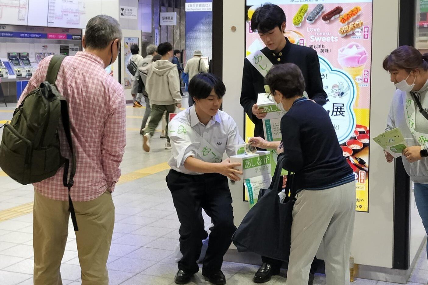 街頭に立ち、通行される方々に募金を呼びかけます。活動を通じて、多くの方が遺児や困窮家庭の子どもたちの進学支援に関心を寄せ、温かいご協力をしてくださる姿に胸を打たれました。